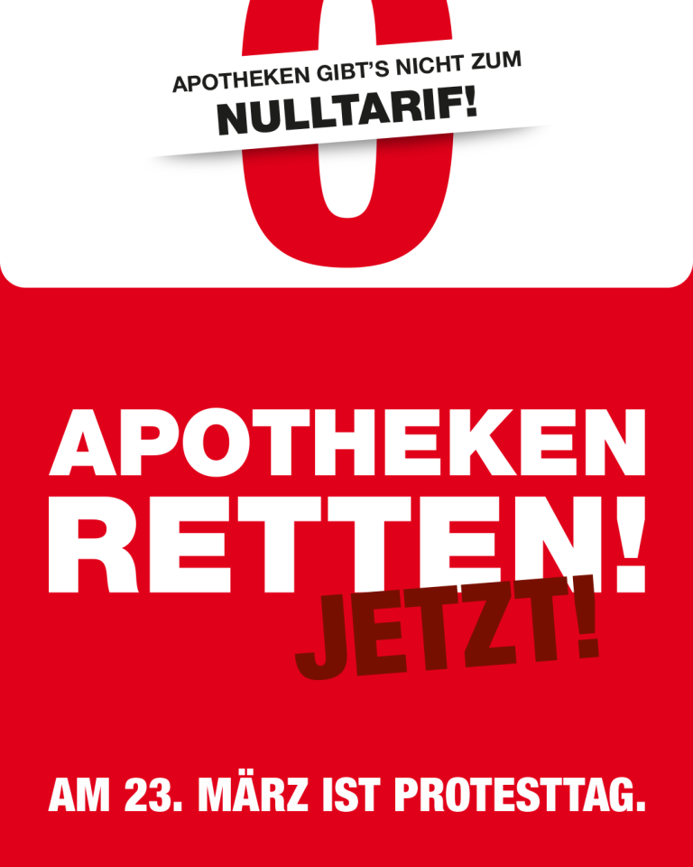 Am 23.03.26 findet ein bundesweiter Protesttag der deutschen Apotheke statt. Aus diesem Grund bleibt unsere Apotheke an diesem Tag geschlossen.Wir demonstrieren für den Erhalt der wohnortnahen Apotheke.