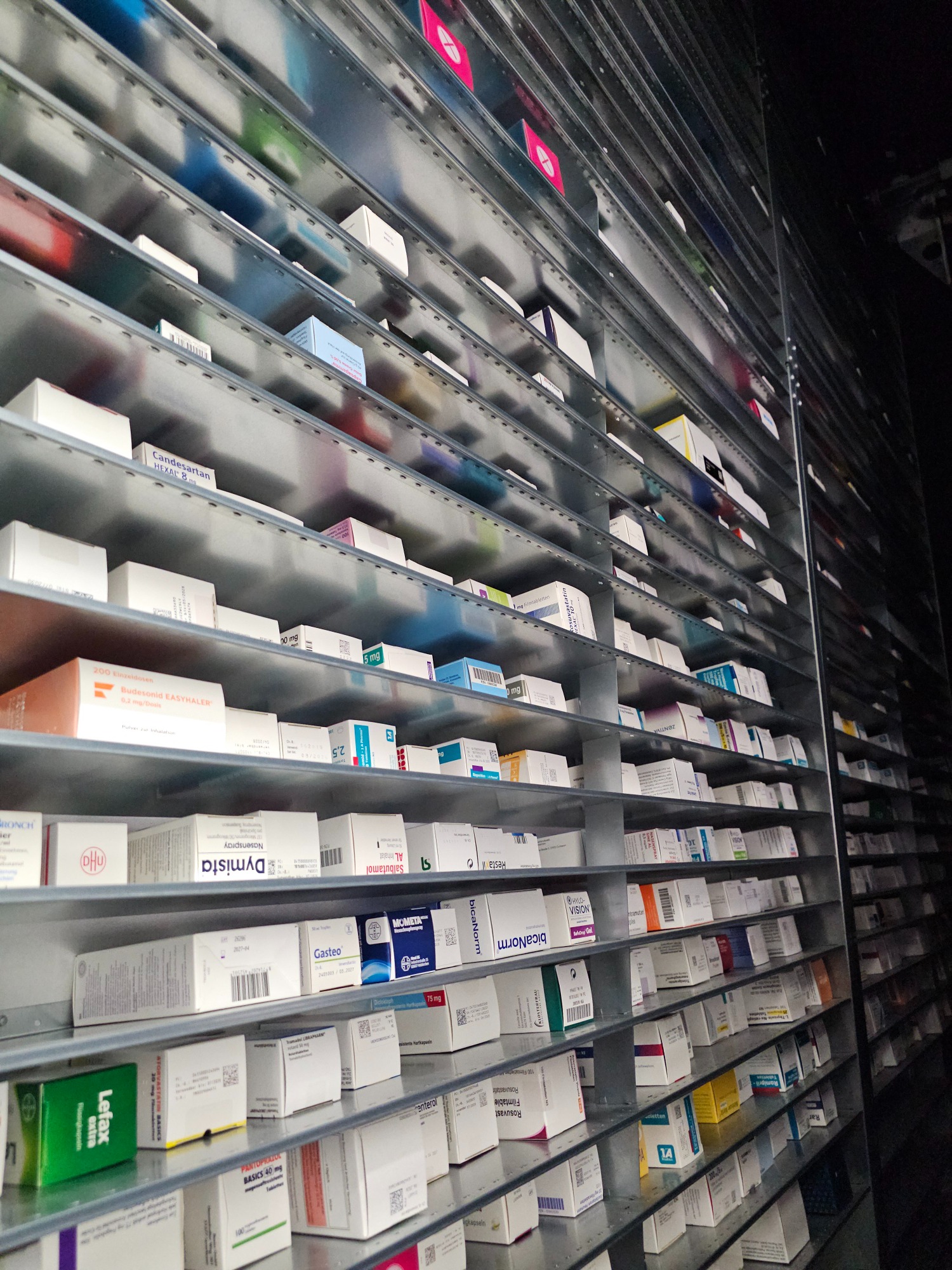 Im Rahmen der Umbaumaßahmen der Marien Apotheke im Jahr 2025 haben wir ein Kommisioniersystem installiert, das uns die tägliche Arbeit wesentlich erleichtert. Im Kommisionierer lagern auf engstem Raum ein Großteil unserer Arzneimittel. Derzeit halten wir ca. 3500 verschiedene Arzneimittel dort für sie vorrätig. Über ein Förderband werden die Arzneimittel direkt in den Verkaufsraum befördert und liegen wenige Sekunden nach Anforderung bereits am Ausgabeschacht bereit. Im Gesamtkontext der knappen Ressourcen im Gesundheitswesen spart diese Art der Lagerhaltung hier bei uns vor Ort wertvolle Arbeitszeit. Aufwendiges und teils fehlerbehaftetes Ein und Ausräumen der klassischen Ziehschubladen durch Mitarbeiter entfällt, die jährliche Inventur ist sehr vereinfacht, Das Durchforsten des Lagers nach vom Verfall bedrohten Artikeln entfällt. Nach wie vor kämpfen wir täglich mit anhaltenden Lieferengpässen, durch diese moderne Art der Lagerhaltung können wir flexibel auf aktuelle Marktbedingungen reagieren und ggf. auch größere Mengen an Arzneimitteln spontan auf Lager nehmen oder auch wieder von Lager nehmen. Dafür stehen uns Lagekapazitäten für ca. 13.000 Arzneimittelpackungen zur Verfügung.