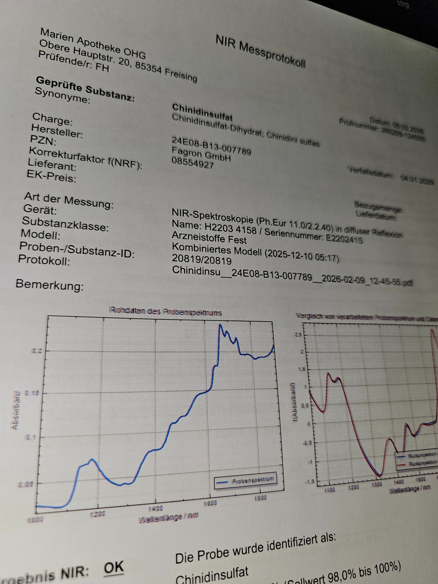 Diese für jede neu eingekaufte Substanz vorgeschriebene und aufwendige Prüfung ist mittlerweile durch validierte spektroskopische Verfahren ersetzt worden. Auch in der Marien Apotheke setzen wir im Hinblick auf die Patientensicherheit solche modernen Verfahren ein. Sie erlauben uns in kurzer Zeit eine Aussagen über die Identität eines gelieferten Rohstoffes zu treffen.